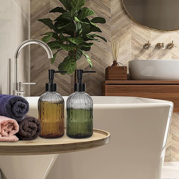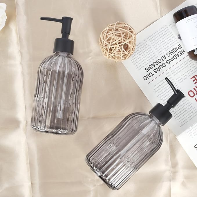 - 【Stylish Design】: Black glass soap dispenser is designed with vertical stripe pattern which is delicate and gorgeous. Those delicate lines match the black hand soap pump and decorate your kitchen or bathroom is both stylish and beautiful. Enhance your bathroom decor with this Clear Refillable Glass Soap Dispenser Set