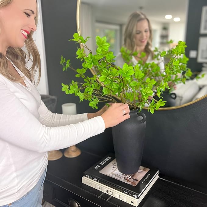 12 Inch Tall Black Ceramic Vase, with 5 Branches of 25 Inch Faux Artificial Vibrant Greenery Stems Set, Textured Minimalist Jug, Fake Stem Plants, Decorative Farmhouse, Console Table Centerpiece Decor