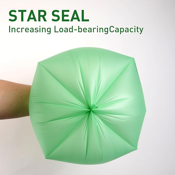 - 13 Gallon Large Mouth Trash Bags: These bags have a wide mouth design for better fitting of different shaped trash cans and loading of waste. The unique star seal design on the bottom of each trash bag prevents leaks, ensuring the compostable bags stay in place and allowing you to carry them with confidence.