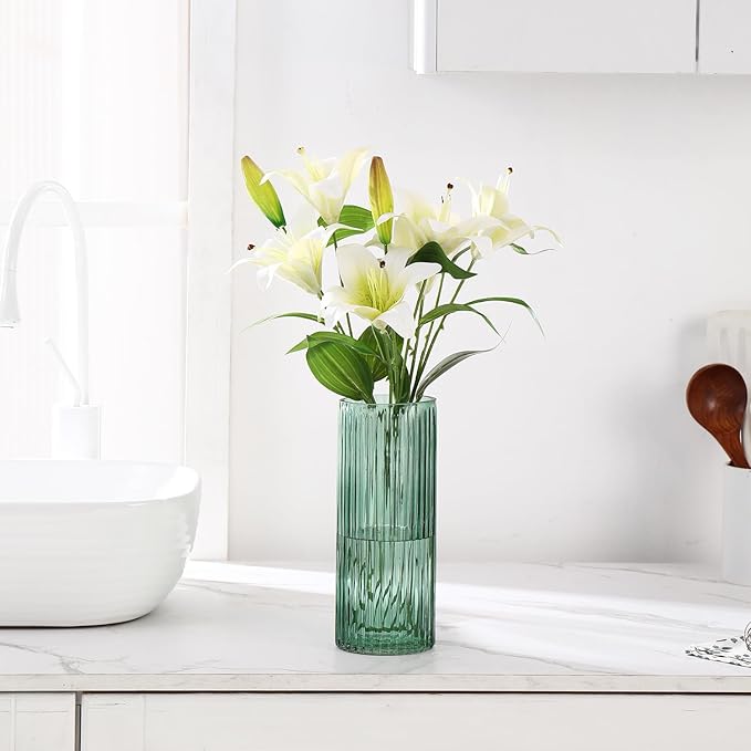 Green Glass Vase, Glass Flower Vase, Ribbed Glass Vase, Green Vase, Tall Cylinder Glass Vases for Centerpieces, Living Room, Bedroom, Dining Table, Office, Wedding, Bookshelf, 10 Inches