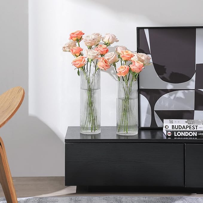Clear Glass Vases, Glass Flower Vases Set of 2, Ribbed Glass Vases, Clear Vase, Tall Cylinder Vase for Centerpieces, Living Room, Bedroom, Dining Table, Office, Wedding, Bookshelf