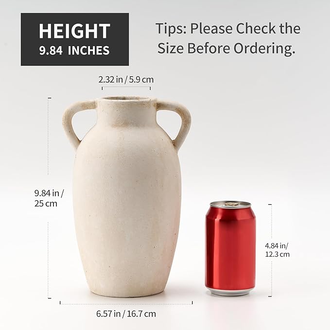Ceramic Vase, 9.84 Inch Terracotta Vase with Handles, Boho Decor Decorative Vase, Rustic Vase for Home Decor, Farmhouse, Living Room, Table - Beige