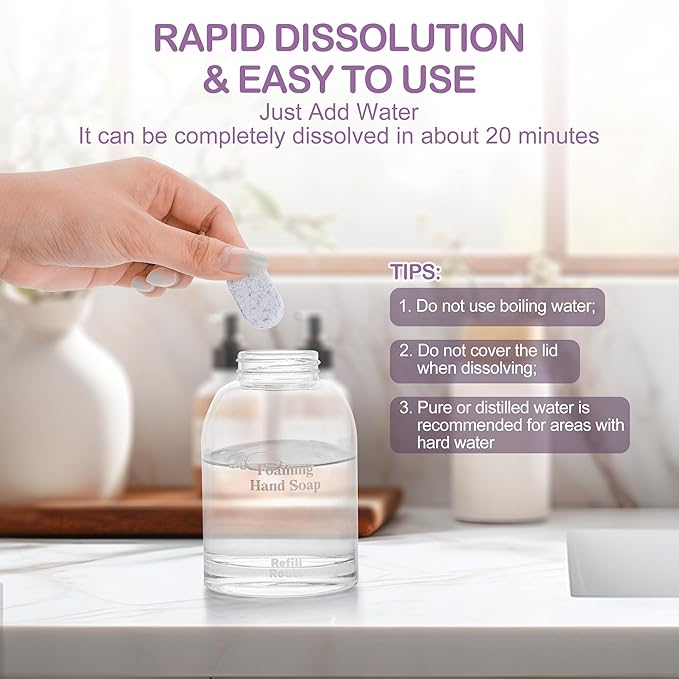 - FAST DISSOLVING UPGRADED FORMULA: Refill Route hand soap tablets use an upgraded formula, they can be completely dissolved in about 20 minutes. Distilled or purified water is recommended for areas with hard water.