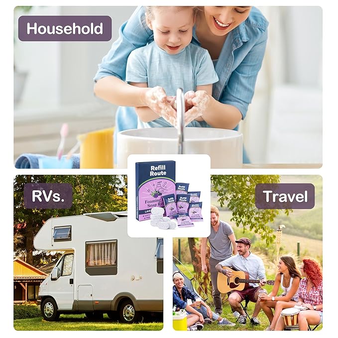 - EMBRACE A MORE SUSTAINABLE FUTURE: Refill Route foaming hand soap tablets are packaged in compostable paper and no plastic. And they are easy to carry, making them perfect for home, travel, camping and more. The tablets are not compatible with normal dispensers but with all foam dispensers.
