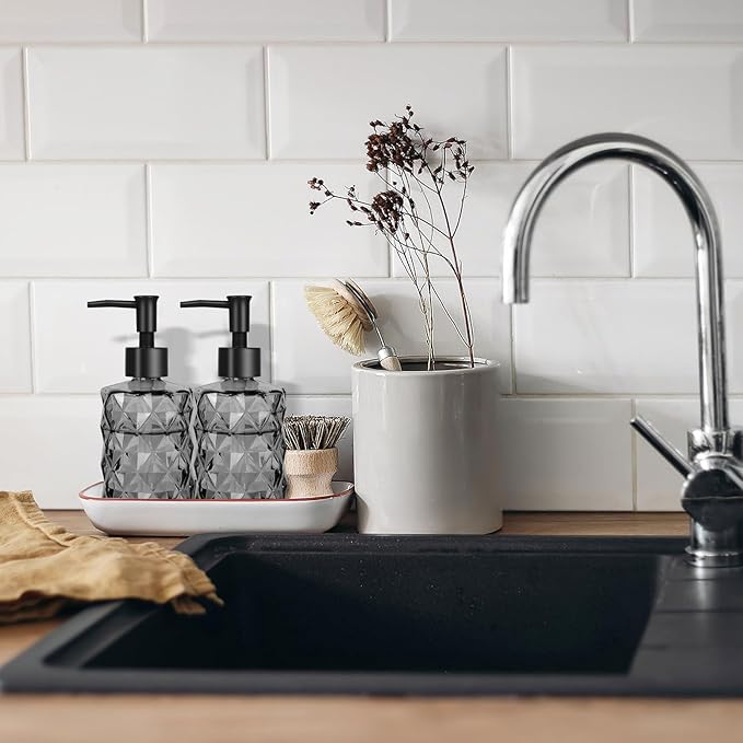 - 【Stylish Design】: Black glass soap dispenser which is delicate and gorgeous. Those delicate lines match the crystal clear and decorate your kitchen or bathroom is both stylish and beautiful. Enhance your bathroom decor with this Clear Refillable Glass Soap Dispenser Set. The black color adds a touch of sophistication to your bathroom countertop, effortlessly complementing any interior design. The diamond pattern on the glass exterior creates a stunning visual effect, making this soap dispenser a conversation starter.