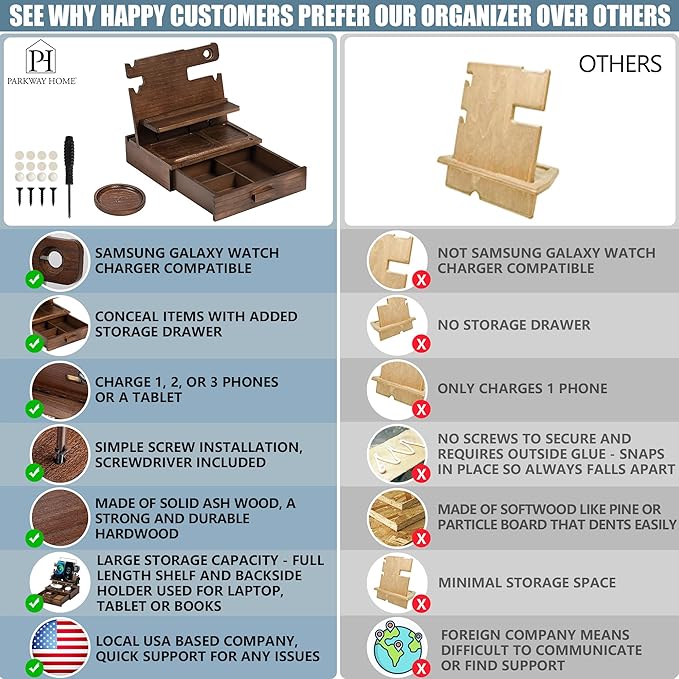 - 🪵Carefully Constructed for Beauty and Durability: Forget cheaply made charging stands; We've crafted our men's docking station and organizer from premium solid ash, famous for rock-hard strength and gorgeous even grain; Choose from 2 versatile versions: with or without a spacious storage drawer; Note: This version comes with drawer