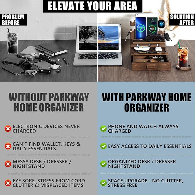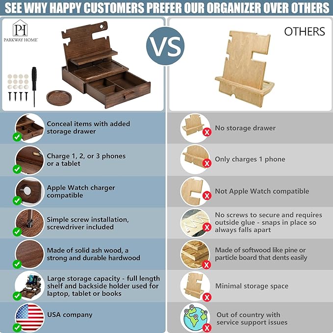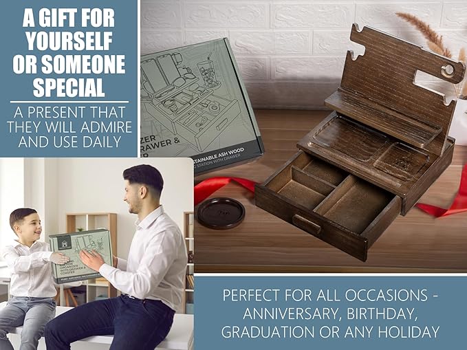 - 🪵Carefully Constructed for Beauty and Durability: Forget cheaply made charging stands; We've crafted our men's docking station and organizer from premium solid ash, famous for rock-hard strength and gorgeous even grain; Choose from 2 versatile versions: with or without a spacious storage drawer; Note: This version comes with drawer