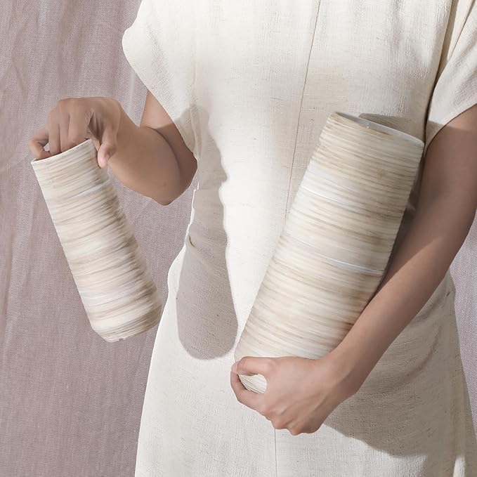 - Aesthetically pleasing:Adding a neutral beige vase to your room can be the finishing touch that it needs. This white ceramic vase has a striped pattern to add texture and appeal. The white-washing finish gives it a vintage feel, making the tall vase more casual and understated. It helps lift ambiance and turns a boring corner into an eye-catcher!