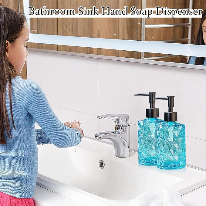 - 【Stylish Design】: Blue soap dispenser is designed with diamond pattern which is delicate and gorgeous. Those delicate lines match the black hand soap pump and decorate your kitchen or bathroom is both stylish and beautiful. Enhance your bathroom decor with this Clear Refillable Glass Soap Dispenser Set. The blue color adds a touch of sophistication to your bathroom countertop, effortlessly complementing any interior design. The diamond pattern on the glass exterior creates a stunning visual effect, making this soap dispenser a conversation starter.