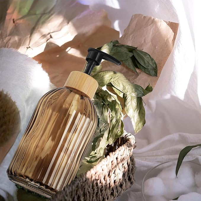 - 【Versatile Application】: Amber glass soap dispenser can be used for liquid soap, dishwashing soap, lotion, shampoo, shower gel, You can use it as a kitchen soap dispenser, or fill it with lotion as a modern and practical bathroom decoration. Designed to enhance your bathroom decor, these dispensers feature a stylish vertical stripe pattern that adds a touch of elegance to any countertop.