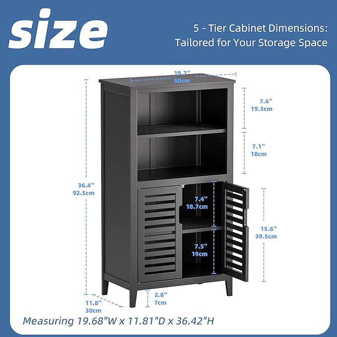 - 5 TIER CABINET WITH REMOVABLE SHELVES - Bring more flexibility to your daily storage. Open shelves are perfect for holding frequently-used items or displaying your collectibles for quick viewing and easy access, while the lower enclosed cabinet with doors and shelves can conceal personal items or cleaning products for privacy. The removable inner shelves of this tall cabinet can accommodate items of different sizes