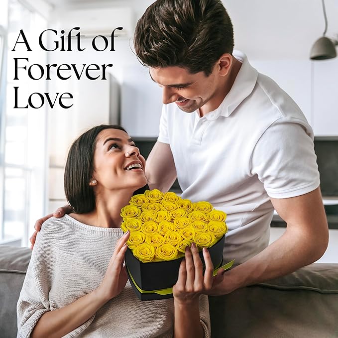 GLAMOUR BOUTIQUE 27 Flower Forever Heart Shape Box - Preserved Roses Gift for Her, Preserved Flowers, Yellow