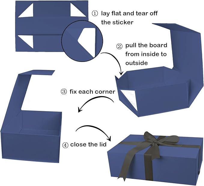 - Easy Assembly-For the first time use,please fold and use in accordance with the assembly steps.just peel off the white triangle stickers at the four corners, then open the sides and glue them together.Press 15 seconds,the box will be very firm.