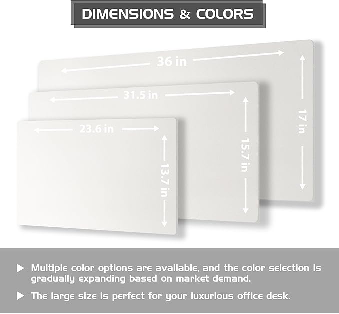 - Variety of Colors and Sizes: Available in a range of colors and sizes, our desk pad can seamlessly blend into diverse office and home environments, catering to individual needs and preferences. Size of 25.6"x13.7", 35.4"x15.7", 37.8"x17", thickness 0.08 inches, thick enough to provide soft and elastic touching; large enough to accommodate your laptop, mouse, keyboard and journal