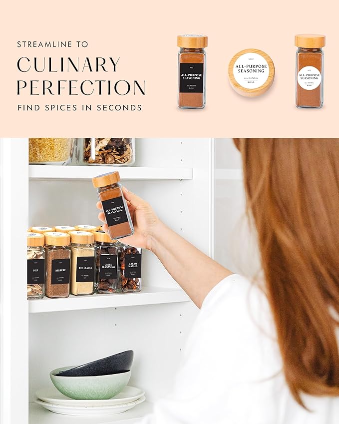 - PINTEREST-PERFECT SPICE ORGANIZATION: Transform your kitchen with our 24-pack bamboo spice bottles empty glass with labels featuring sleek black labels. This set includes 24 glass spice jars with bamboo lids, 240 black spice labels, and a collapsible silicone funnel, making your spices both organized and easily accessible, all while adding a stylish, modern touch to your space