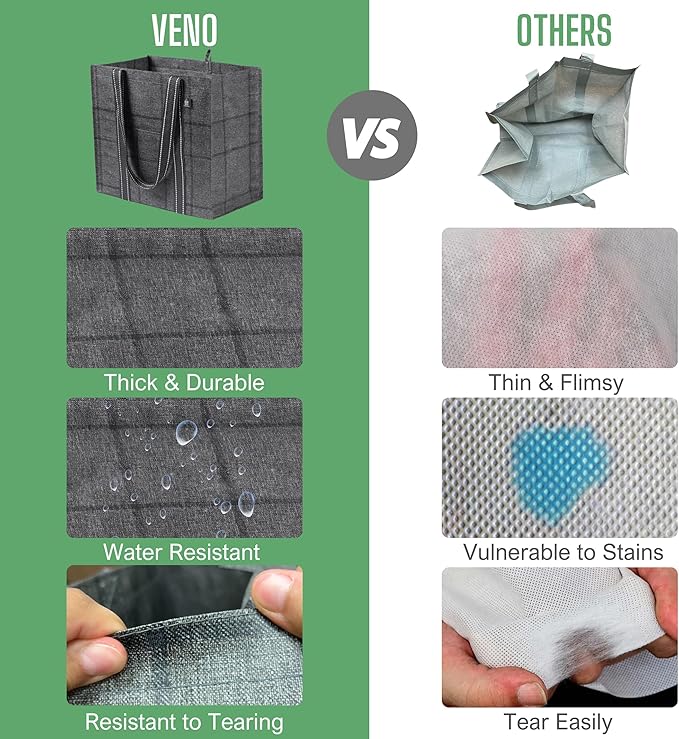 - Reusable & Sustainable to Protect the Environment – VENO reusable grocery shopping bags are created through maximizing the use of post-consumer material to make high-grade bags that save plastic from ending up in oceans, lakes, and landfills. Help us in protecting our environment to create a cleaner, more livable future. Collapsible and foldable for future use and easy storage in your car, glove compartment, kitchen, cabinet, drawer, luggage, or purse!