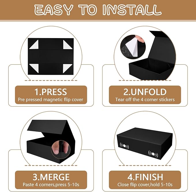 - Easy to Assemble:The large gift boxes are easy to assemble,Upon receipt of the product, tear off the stickers at the corners, fold it into a rectangular shape, press the corners to make the paste firmly. Then you will get a simple but elegant wrapping box for gift packaging