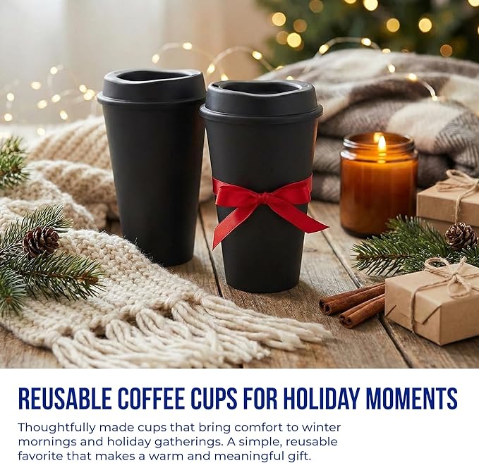 Rolling Sands USA Made 16 oz Reusable Coffee Cups with Lids 2 Pk, To Go Travel Cups, Hot or Cold Drinks, Dishwasher and Microwave Safe, Black
