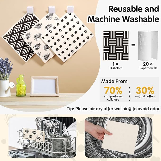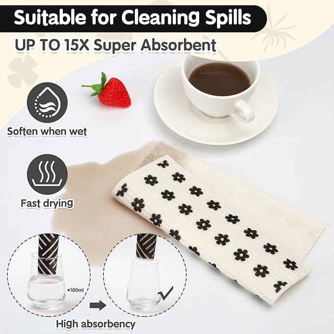 - [Absorb & Dry Quickly] Made of 70% cellulose and 30% cotton, 100% biodegradable compostable like paper towel, but washable reusable like sponge, the Swedish cloths can pick up a lot of liquid (absorbing up to 15 times its own dry weight) without leaking and make cleaning much easier, more sustainable than going through several rolls of paper towels. When put towels in the dryer, pull out the Swedish dishcloths, and lay flat to dry after each use, it will be reusable times through the well care.