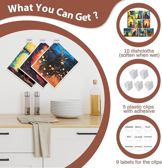 - [Swedish Dishcloths Set] These dishcloths come in a 10-pack variety of lovely patterns, which are fun to choose depending on your decor. Also included in this particular set are little sticky-back clips so you can fasten to your cupboards or areas you would like to have a cloth handy, also hang them to dry on these hooks after use with a good rinse and wring them out well.