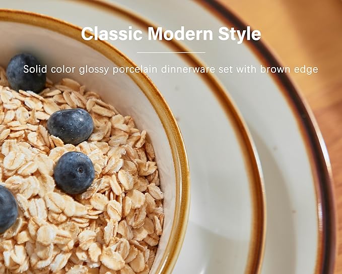 - Farmhouse Style: Cream white porcelain dishes set, the brown edges of the plates and bowls are hand-painted, with maroon speckles scattered across each plate (no speckles on the bowls).Simple modern style and exquisite design bring artistic flair to these plates and bowls sets, which can be integrated into most kitchen environments and add highlights to your dining table