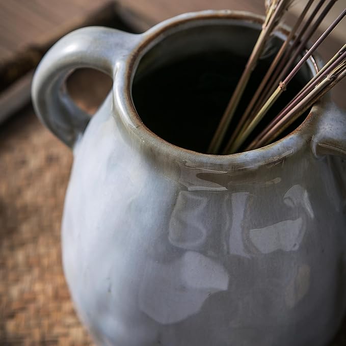 - Decorative Vase - The rustic ceramic vase made of high quality ceramic with special creative glaze finish, makes the vase looks soft and elegant. The unique design of the two handles is convenient for us to carry the vase. Size : 7 1/8"L x 5 3/4"W x 7 1/4"H with a 3"opening.