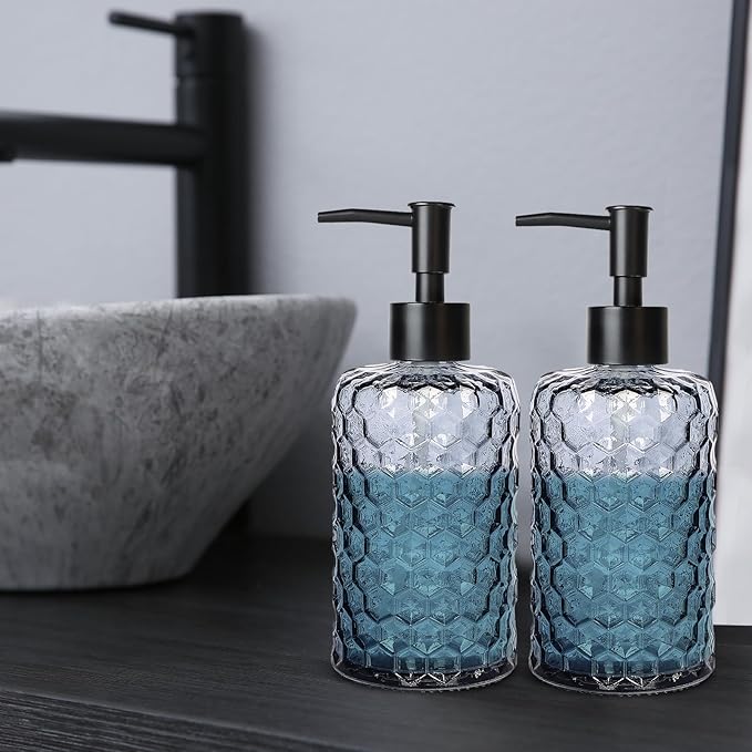 - 【Versatile Application】: Blue glass soap dispenser can be used for liquid soap, dishwashing soap, lotion, shampoo, shower gel, You can use it as a kitchen soap dispenser, or fill it with lotion as a modern and practical bathroom decoration. Designed to enhance your bathroom decor, these dispensers feature a stylish honeycombed pattern that adds a touch of elegance to any countertop.