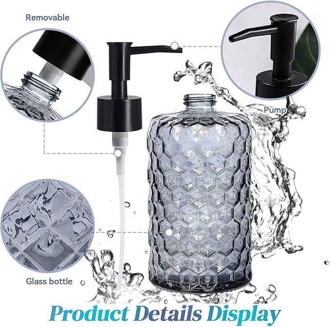 - 【Stylish Design】: Blue soap dispenser is designed with honeycombed pattern which is delicate and gorgeous. Those delicate lines match the crystal clear and decorate your kitchen or bathroom is both stylish and beautiful. Enhance your bathroom decor with this Clear Refillable Glass Soap Dispenser Set. The light blue color adds a touch of sophistication to your bathroom countertop, effortlessly complementing any interior design. The honeycombed pattern on the glass exterior creates a stunning visual effect, making this soap dispenser a conversation starter.
