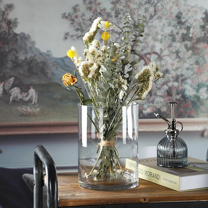 6" Wide 8" High Large Hand Blown Sturdy Clear Cylinder Glass Vase, Centerpiece Flower Vase for Rose, Tulip, Boquets, Hurricane Candle Holder (1, 6"x8")