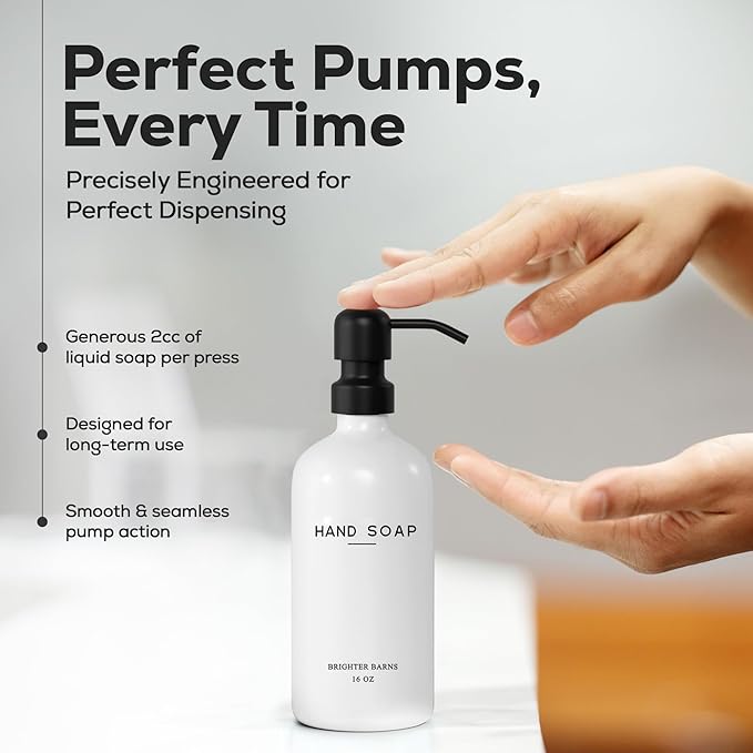 - AMERICAN DESIGN, UNCOMPROMISING QUALITY - Crafted with meticulous attention to detail, our glass soap dispenser set features 2 fortified 16oz glass bottles along with a set of corrosion-proof 304G stainless steel matte black pumps. All designed in the USA to provide unbeatable quality and enduring style that you can trust.