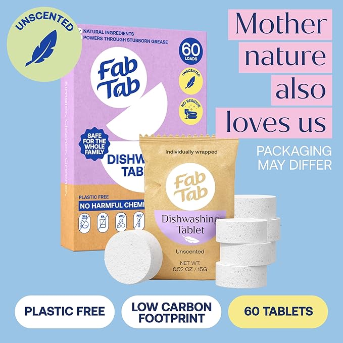 - Powerful Cleaning: Fab Tab dishwasher tablets power through grease, leaving dishes sparkling with no residue. These unscented dishwasher tablets dissolve fast, ensuring a spotless finish every time.