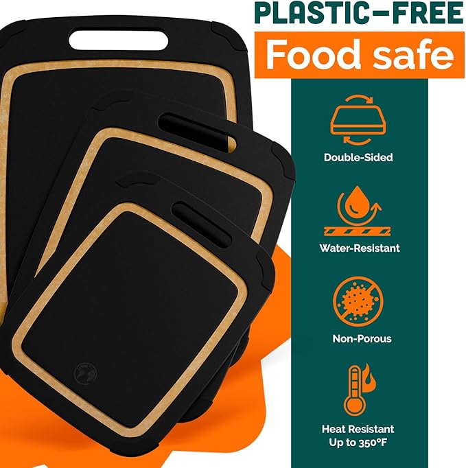 - LARGE WOOD CUTTING BOARD SET: A balanced combination of durability, hygiene, eco-friendliness, and knife-friendliness ensures that paper composite cutting boards are not only an ideal choice for both home cooks and professional chefs, but also provide long-lasting performance and peace of mind in the kitchen. The Extra Large Size can even be used as a Charcuterie Board.