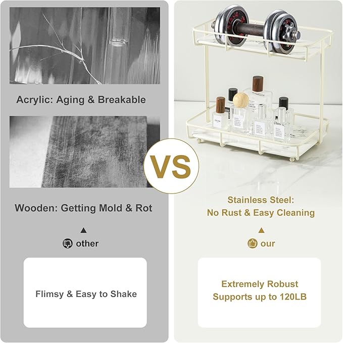 - EASY TO CLEAN: With a sturdy stainless steel frame that can prevent corrosion in wet places and removable ceramic trays with a luxurious marble pattern, this dresser top stand is both functional and easy to clean.