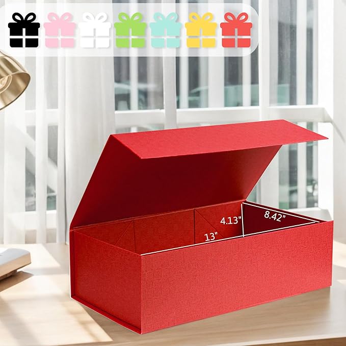 - Package Content - The package includes 1 red gift box with lid for presents, 1 gold ribbon, 1 greeting card, 1 envelope and 6 stickers. The generous gift box measures 14x8.7x4.3 inches, providing ample space for your thoughtful presents.