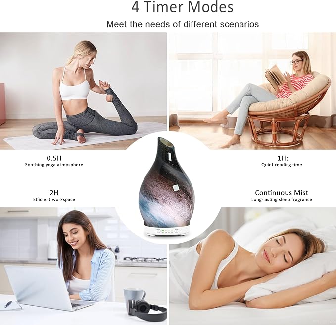 - 4 TIMER SETTINGS, SAFE AND RELIABLE: The diffusers for home is equipped with 4 timers to set the operation time. You can choose the continuous working time according to your personal needs, such as 0.5 hour, 1 hours or 3 hours. The aromatherapy oil diffuser has a built-in auto shut-off function that automatically shuts off when the water runs out or the working time reaches the preset upper limit, preventing overtime and dry burning damage. Provides added safety and convenience