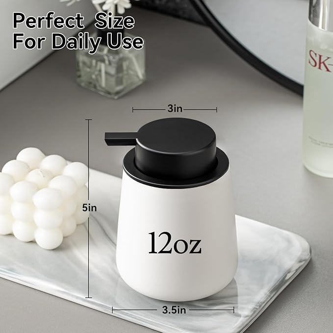 Foaming Soap Dispenser - 12 OZ White Ceramic Foam Soap Dispenser for Bathroom, Hand Wash Dispenser Bottle with Black Foaming Pump, Refillable Dish Dispenser Kitchen