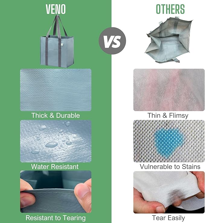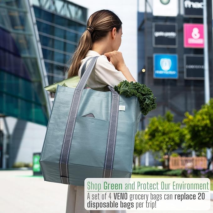 - Reusable & Sustainable to Protect the Environment – VENO reusable grocery shopping bags are created through maximizing the use of post-consumer material to make high-grade bags that save plastic from ending up in oceans, lakes, and landfills. Help us in protecting our environment to create a cleaner, more livable future. Collapsible and foldable for future use and easy storage in your car, glove compartment, kitchen, cabinet, drawer, luggage, or purse!