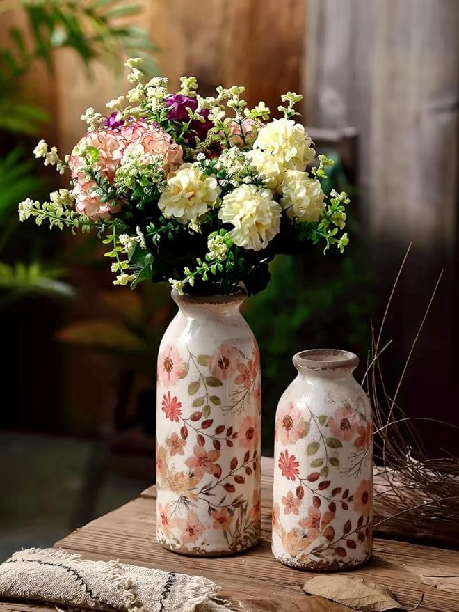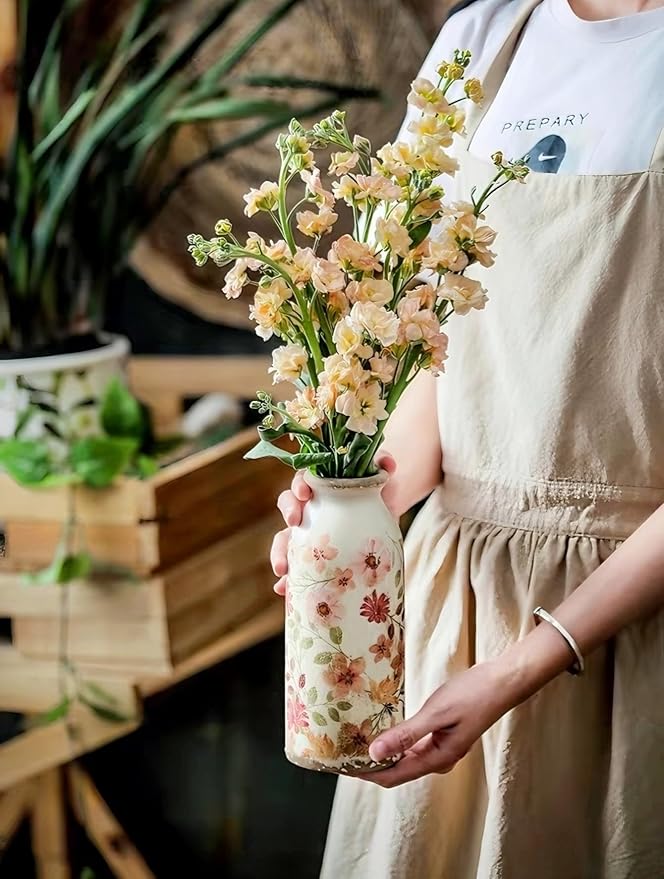 - VINTAGE STYLE DESIGN: This ceramic floral vase has a vintage country style design inspired by antique pots, featuring delicate hand-painted floral motifs and enameled accents.