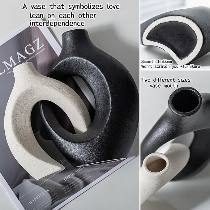 Black and Off-White Vases for Decor, Hollow Ceramic Vase Set of 2, Nordic Minimalist Aesthetic Snuggle Vases, for Table Centerpiece Dining Living Room Book Shelf Decoration (W 6.3" X H 8.4")