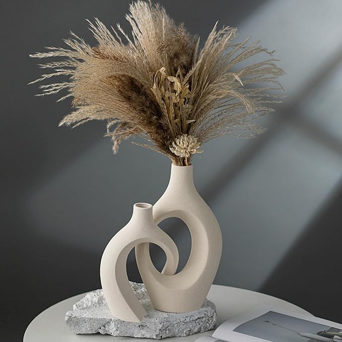 XL Cream White Snuggle Hollow Ceramic Vase of 2 for Coffee Table Decor, Modern Minimalist Aesthetic Donut Floral Vases, for Home Living Room Entryway Table Shelves Decorative (W 6.8" X H 11")
