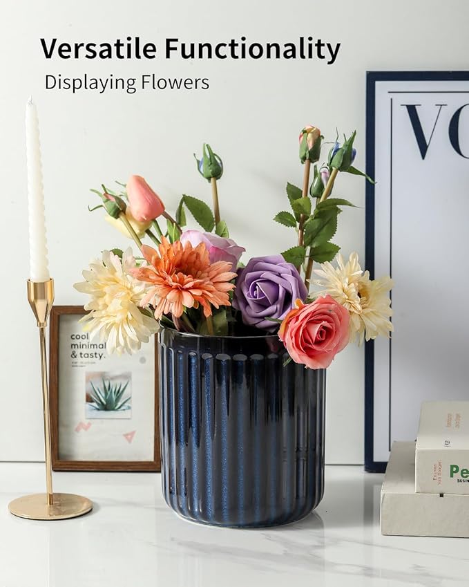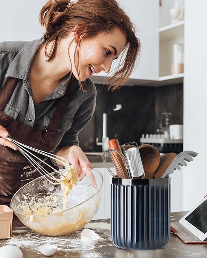 - Textured Elegance: This ceramic navy blue utensil holder features a ribbed texture with lighter flecks, enhancing your kitchen decor and adding a tactile touch that enriches your countertop’s charm