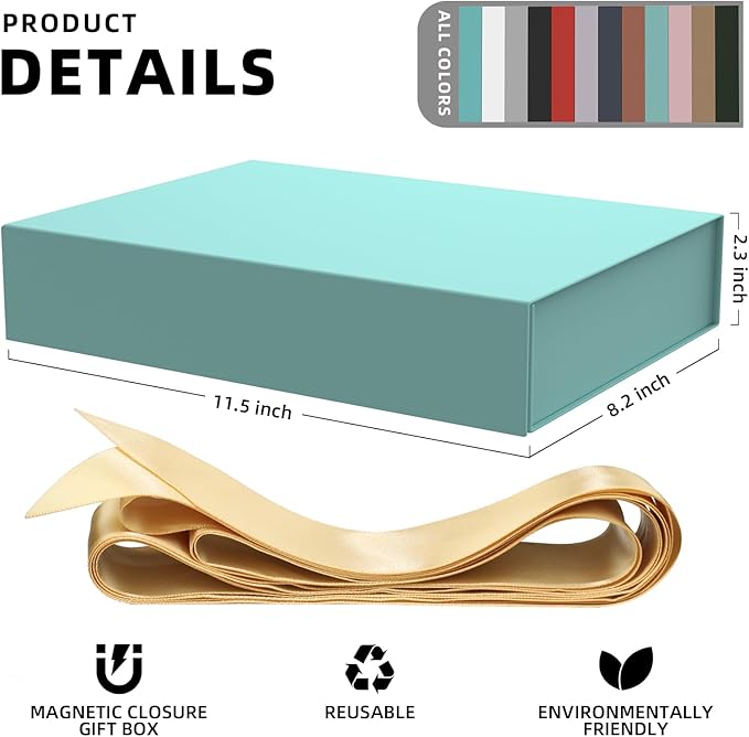 - HIGH QUALITY MATERIAL: Crafted from high-quality cardboard, our gift box features a sleek, glossy finish and a secure flip-top lid. Built to last, it ensures your gifts remain safe and stylish. Choose from a variety of colors and sizes to suit your gifting needs. (Includes a 1.5 x 10-inch champagne gold ribbon.)
