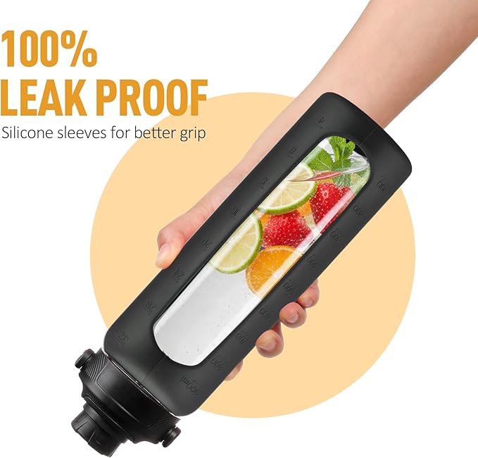 32oz Glass Water Bottle with Straw and 2 Lids- Bamboo and Spout Lid,Motivational Sports Water Bottle with Silicone Sleeve and Time Marker,Reusable for Gym, Outdoors, Black