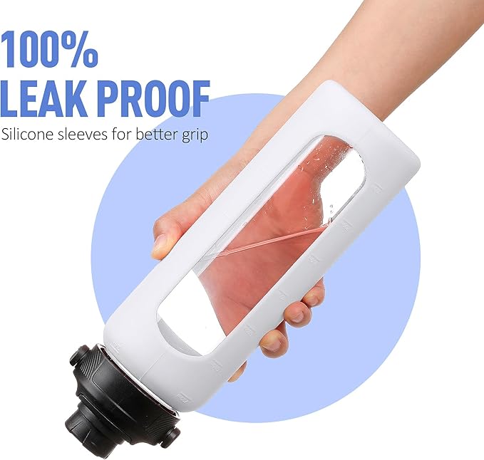 24oz Glass Water Bottle with Straw and 2 Lids-Bamboo and Spout Lid, Borosilicate Glass Water Bottle with Silicone Sleeve and Time Marker,BPA Free & Cupholder Friendly,White