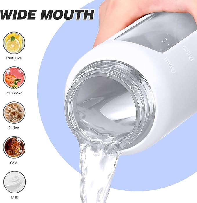 - CUP HOLDER FRIENDLY- Choose the NOLOGLAZIC glass water bottles keeps you hydrated. Moreover, it fits most car cup holders, making it the perfect companion for drivers. The wide-mouth design makes it easy to fill with ice cubes and fruits, and easy to clean daily.