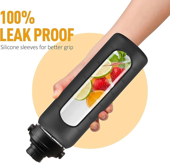 - HIGH-QUALITY & 100% BPA FREE - Our borosilicate glass water bottle is free from BPA, BPS, PVC, and lead. The stylish silicone sleeve adds extra protection against slips and falls. It is suitable for both hot and cold beverages (-4°F to 302°F).