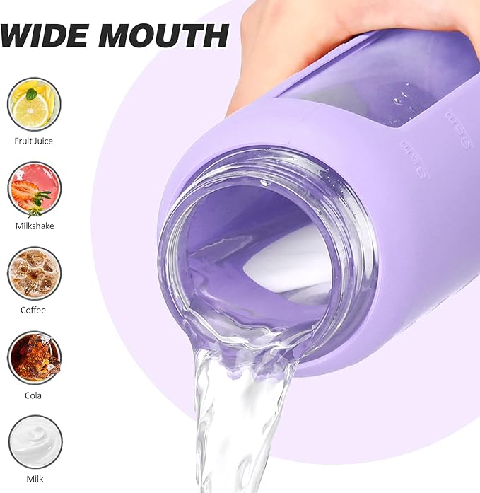 - CUP HOLDER FRIENDLY- Choose the NOLOGLAZIC glass water bottles keeps you hydrated. Moreover, it fits most car cup holders, making it the perfect companion for drivers. The wide-mouth design makes it easy to fill with ice cubes and fruits, and easy to clean daily.