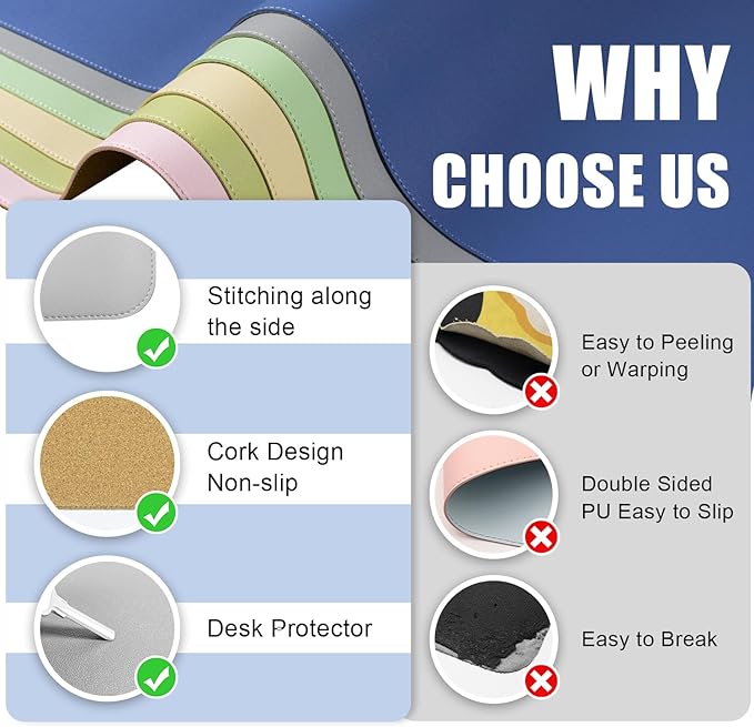 - Superior Protection Mat for Desk: Durable PU leather and cork material, provide reliable protection for your desk surface. Safeguard your tabletop from everyday wear and tear with our Dual-Sided Desk Pad. This large mouse pad and desk mat combo is a protective barrier, preventing scratches, scuffs, and spills from damaging your workspace.