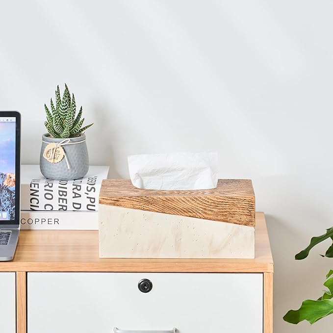 Rectangular Natural Travertine and Rustic Wood Textures Tissue Box Cover for Bathroom,Livingroom,Bedroom, Hand-Made Resin Wood Inlaid Travertine Tissue Box Holder,10 x 5.7 x 4.5 in