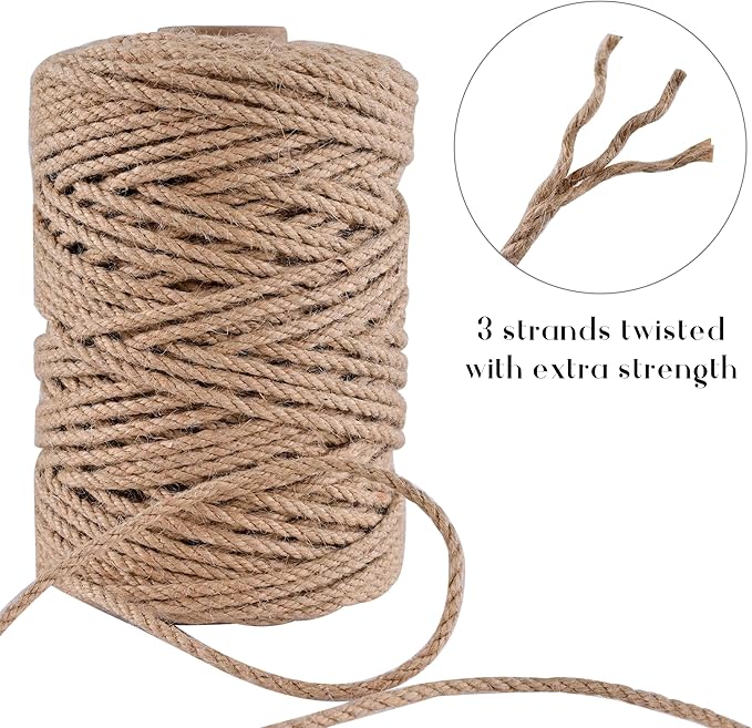- 【Strong and Durable】4mm-656ft natural jute rope, made of 3 strands of twisted jute rope to ensure its strength and durability,Can be easily knotted or braided, perfect for indoor and outdoor use